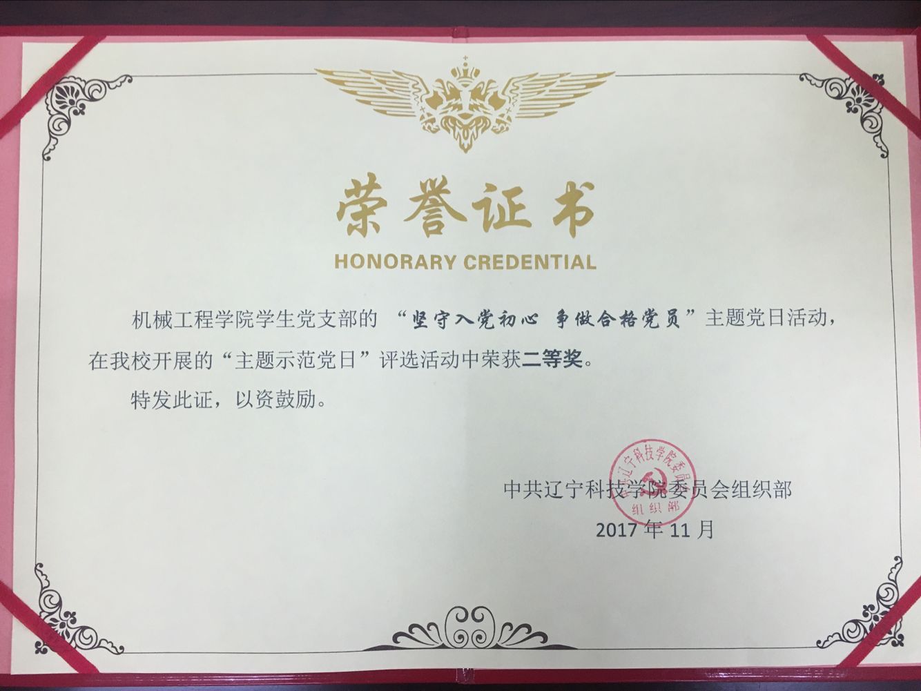 机械学院学生党支部的“坚守入党初心争做合格党员”主题党日活动中,在我校开展的“主题示范党日”评选活动中获二等奖。