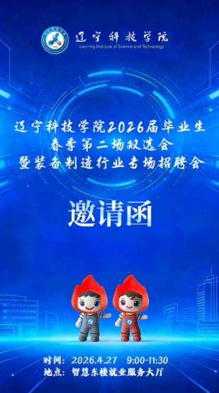 尊敬的用人单位:韶光向暖,芳菲正盛。在这繁花似锦、充满希望的春日里,辽宁科技学院恰似一艘扬帆待发的巨轮,再度迎来人才交流的崭新航程。为持续深化校企合作,架设人才与机遇的坚实桥梁,助力企业精准揽才、学子理想启程,我校将隆重举办“百校千企”人才对接计划——辽宁科技学院2026届毕业生春季第二场双选会暨装备制造行业专场招聘会。在此,特向贵单位发出最诚挚的邀请,诚盼您拨冗参会,广纳青年才俊,携手共筑人才引育新生态,谱写校企合作共赢新篇章!