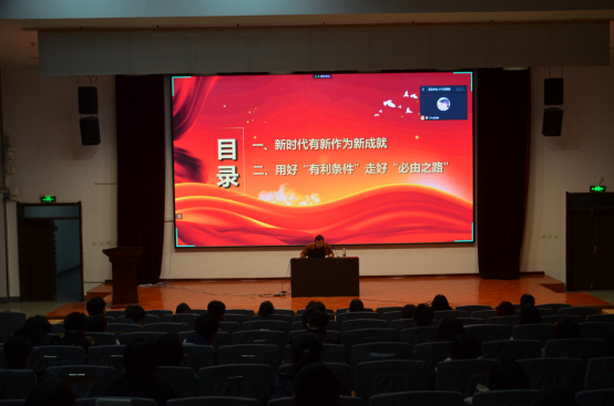 赵亮从新时代有新作为新成就和用好“有利条件”走好“必由之路”两方面与同学们共同回顾了走进新时代中国10年跨越式巨变,党以伟大的历史主动精神、巨大的政治勇气、强烈的责任担当,统筹国内国际两个大局,统揽伟大斗争、伟大工程、伟大事业、伟大梦想,党和国家事业取得的历史性成就、发生的历史性变革,勉励同学们要深入领会“两个确立”的决定性意义,增强“四个意识”、坚定“四个自信”、做到“两个维护”,要弘扬中国精神,践行伟大民族精神、伟大时代精神、伟大建党精神,坚定不移走好“必由之路”,掌握主动,用好“有利条件”,克服一切艰难险阻,乘风破浪行稳致远,肩负起新时代赋予我们的历史重任,勿忘昨天的苦难辉煌,无愧今天的使命担当,不负明天的伟大梦想,坚定理想信念,厚植家国情怀,让青春年华在为国家、为人民的奉献中焕发光芒。