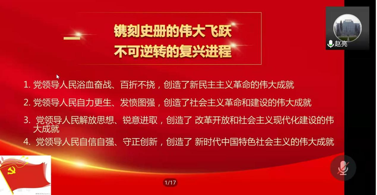 赵亮院长从镌刻史册的伟大飞跃,不可逆转的复兴进程;气象万千的伟大时代,浓墨重彩的崭新篇章;永葆初心的大党担当,伟大光荣的历史贡献;弥足珍贵的精神财富,开创未来的行动指南四方面带领同学们共同回顾了党领导人民创造的历史性伟大成就,浓墨展示了气象万千的新时代,中华民族迎来了从站起来、富起来到强起来的伟大飞跃,讲述了党百年奋斗的伟大历史意义和宝贵历史经验,用“两个结合”、“十个明确”阐释了习近平新时代中国特色社会主义思想是立足时代之基、回答时代之问、引领时代之变的科学理论,详细讲述了新时代的历史性成就和历史性变革,以及党的百年奋斗对中国人民、对中华民族、对马克思主义、对人类进步事业、对马克思主义政党建设作出了历史性贡献,深刻阐述了“十个坚持”是百年来党领导人民艰辛探索、接续奋斗理论和实践的深刻总结,是党无往不胜的成功密码。