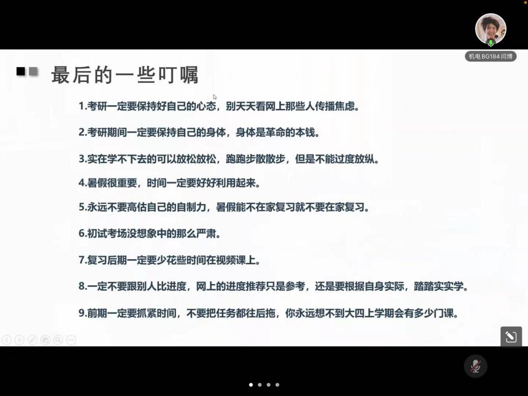 在经验分享会上主讲嘉宾条分缕析地为大家分享自己各科的复习规划以及相关的学习资料,建议大家要在做练习题中掌握技巧,要有技巧的学习才能事半功倍。还为大家推荐可以获取免费学习资料的考研公众号,建议大家合理利用新媒体,即使在疫情封校的情况下也要用电子设备进行高效学习。