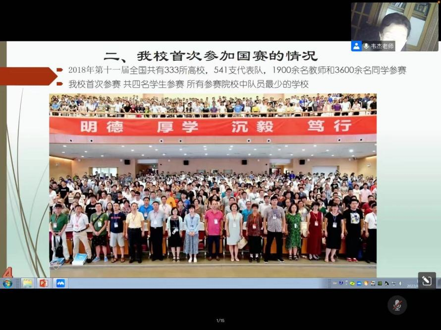 接着,韦杰老师向同学们介绍了我校首次参加国赛的情况。参赛学校不胜枚举,名校也不在少数。我校首次参赛共四名学生,是所有参赛院校中队员最少的学校,但我校学生不负使命,荣获了2018年国赛三等奖一项,为以后的比赛增添了信心与底气。紧接着在2019年的国赛由五位同学荣获三个奖项。我校曾经辉煌的历史,激励着越来越多的辽科学子们报名参加。
