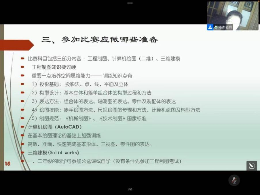 为提高学生的专业素养,培养学生的创新意识、较强的空间想象力、图学思维能力、综合设计能力与团队协作精神,促使学生掌握扎实的基础知识,提高学生的工程制图能力,2022年4月15日晚上19点《大学生创业创业基础》实践课程专家讲坛之“大学生工程制图与三维建模竞赛指导”专题报告会在腾讯会议准时开讲。本次报告会由创新创业学院主办、机械工程学院承办,由机械工程学院韦杰老师主讲,王任胜副院长进行指导,全校各专业的学生参加本次报告会。