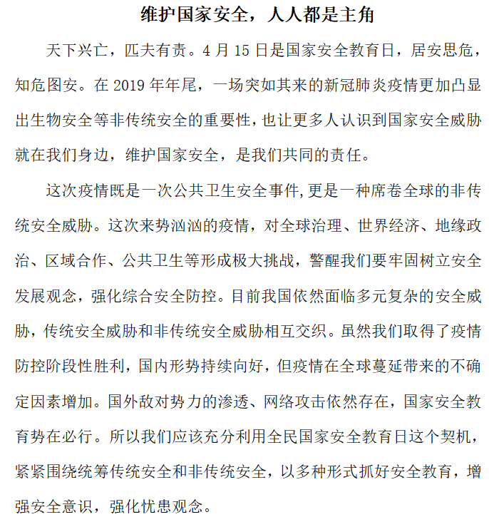 本次国家安全教育日宣传活动的开展,有利于同学们树立国家安全意识,进一步掌握国家安全知识,加深了同学们维护国家安全的责任感,便于同学们更好的履行维护国家安全方面的责任和义务,为迎接党的二十大胜利召开营造了良好氛围。