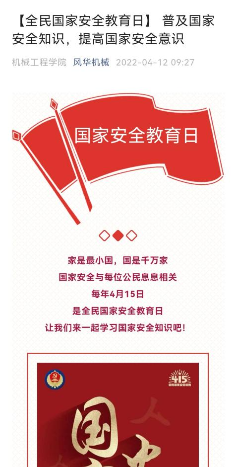 为增强大学生维护国家安全的责任感,切实提高大学生维护国家安全的责任意识,在第七个全民国家安全教育日来临之际,机械工程学院于2022年4月11日—4月14日开展了以“筑起人民防线,维护国家安全”主题教育宣传活动。