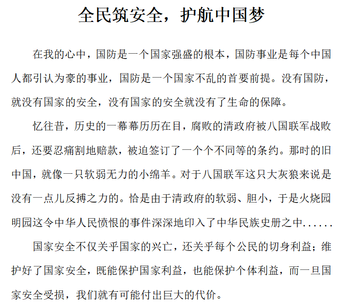 第二部分开展以“筑起人民防线,维护国家安全”为主题征文活动。同学们紧扣主题,以国家安全为背景,纷纷把自己对国家安全的思考与感悟写进文章,真实具体地表达出自己的认识和感受及对国家安全的高度重视和关注。