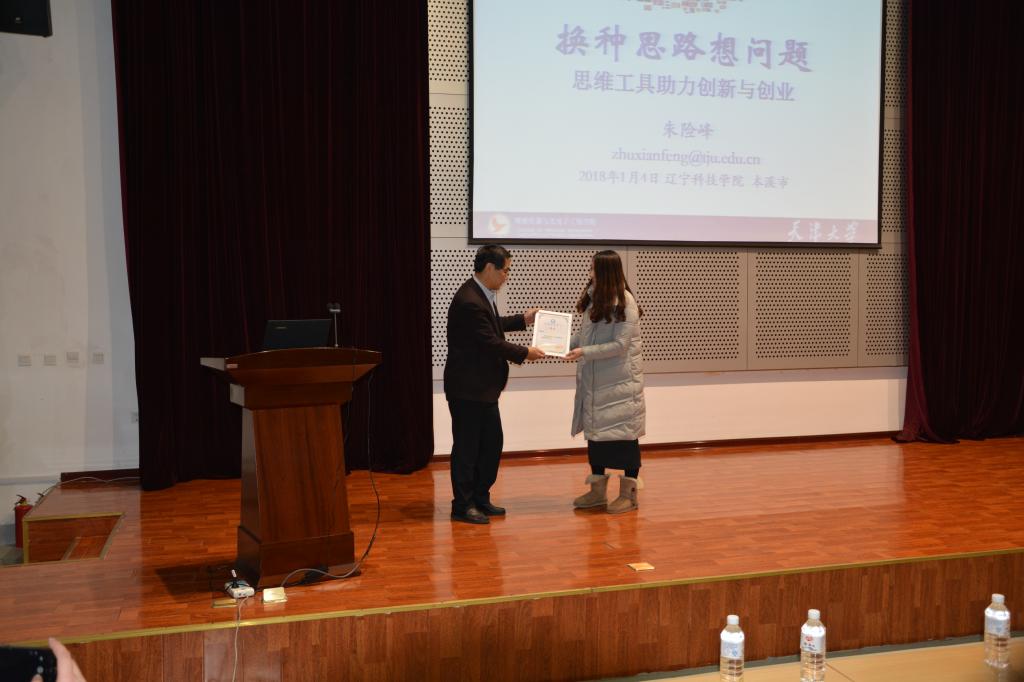 讲座前,韩院长正式聘请朱险峰教授担任辽宁科技学院创新创业导师,并颁发聘书。